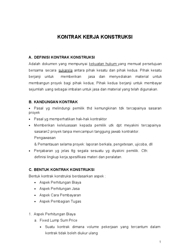 Dengan demikian kontrak kerja konstruksi yang juga merupakan kontrak bisnis adalah perjanjian tertulis antara dua atau lebih pihak yang mempunyai nilai komersial (hikmahanto juwana, 2001). Urutan 4, surat perintah kerja. Pemutusan kontrak kerja konstruksi, memuat ketentuan tentang pemutusan kontrak kerja konstruksi yang timbul akibat tidak dapat dipenuhinya kewajiban salah satu pihak Jenis jenis construction contract :1. Kontrak kerja konstruksi dengan bentuk imbalan lump sum merupakan kontrak jasa atas penyelesaian seluruh pekerjaan dalam jangka waktu tertentu, dengan jumlah harga yang pasti dan.
